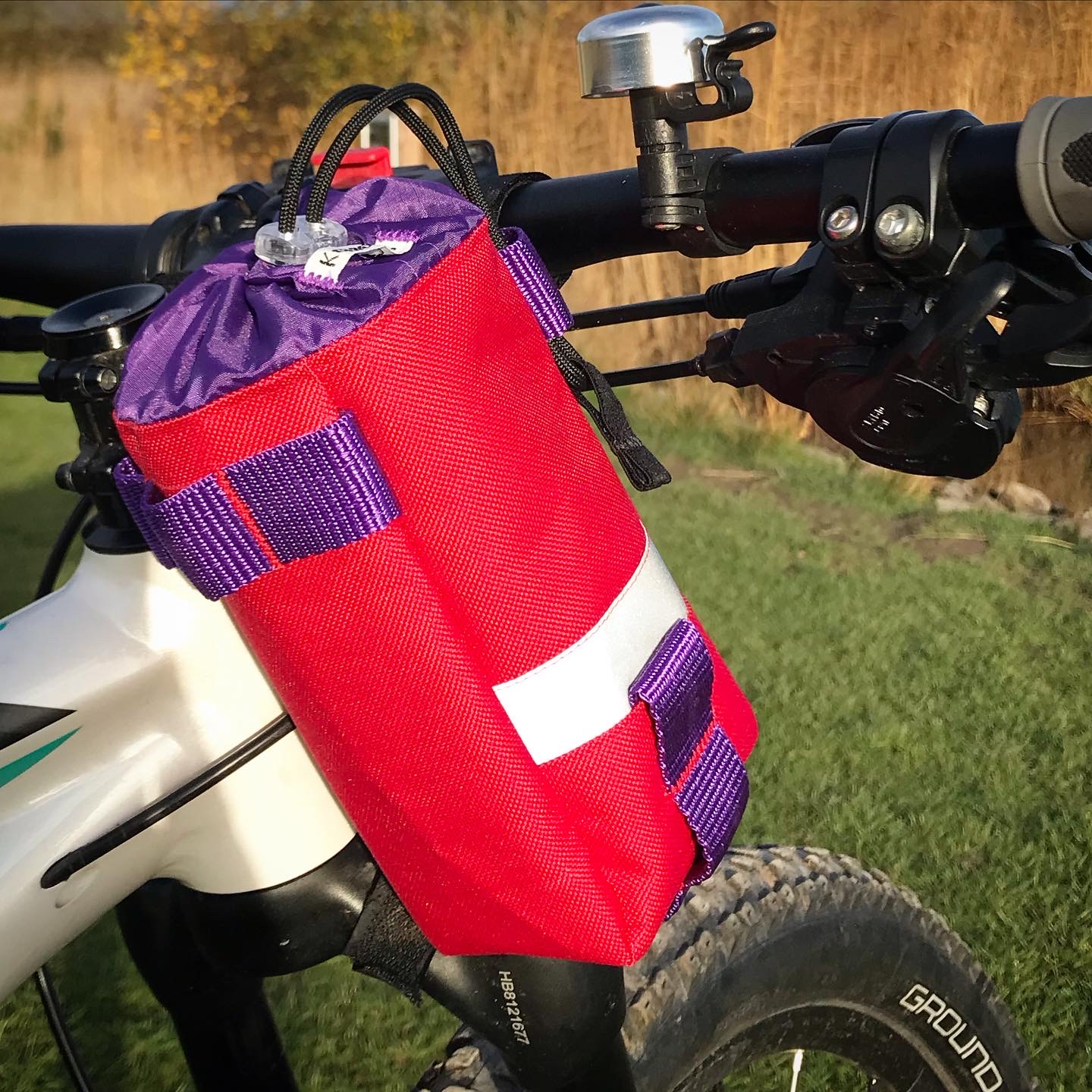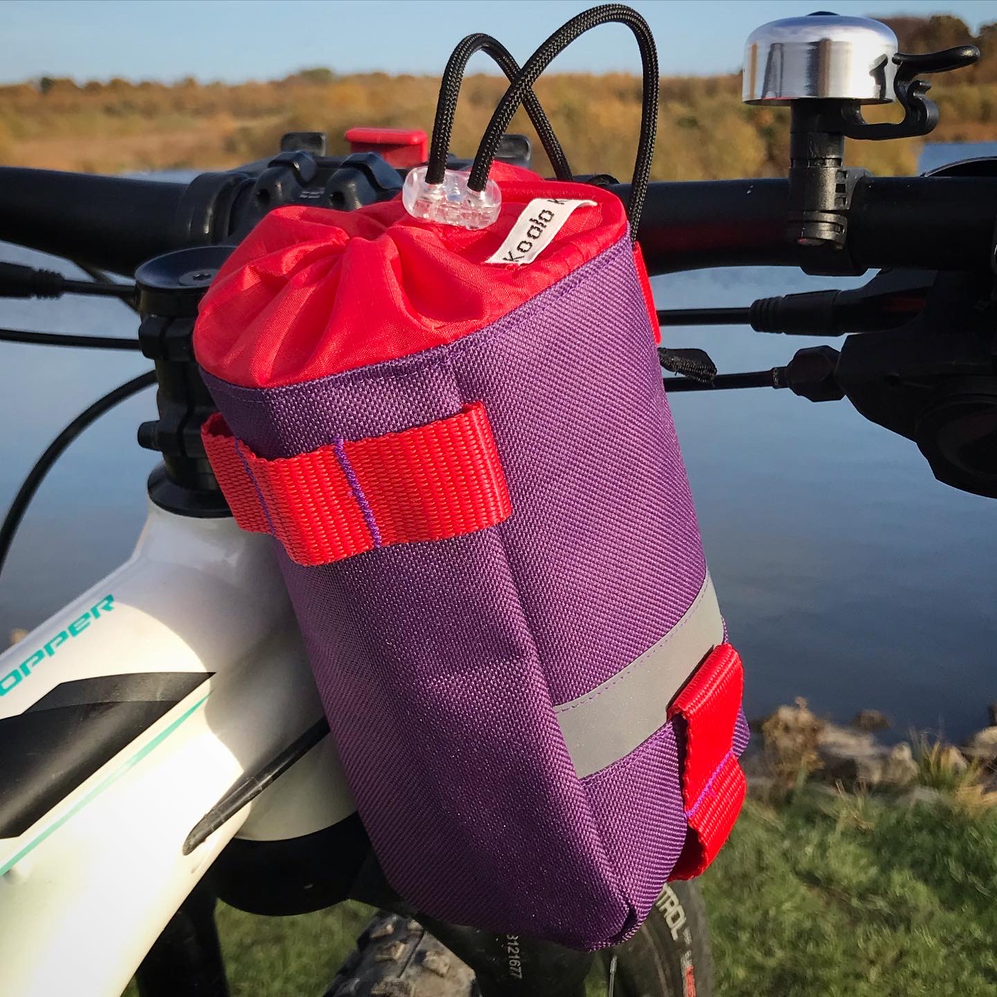 1x Koala Kit stem bag in Red, with Purple webbing. The main body of the bag is Cordura, with a ripstop nylon closure and lining. There are two reflective trims and a transparent cord stopper. Red, with Purple webbing.