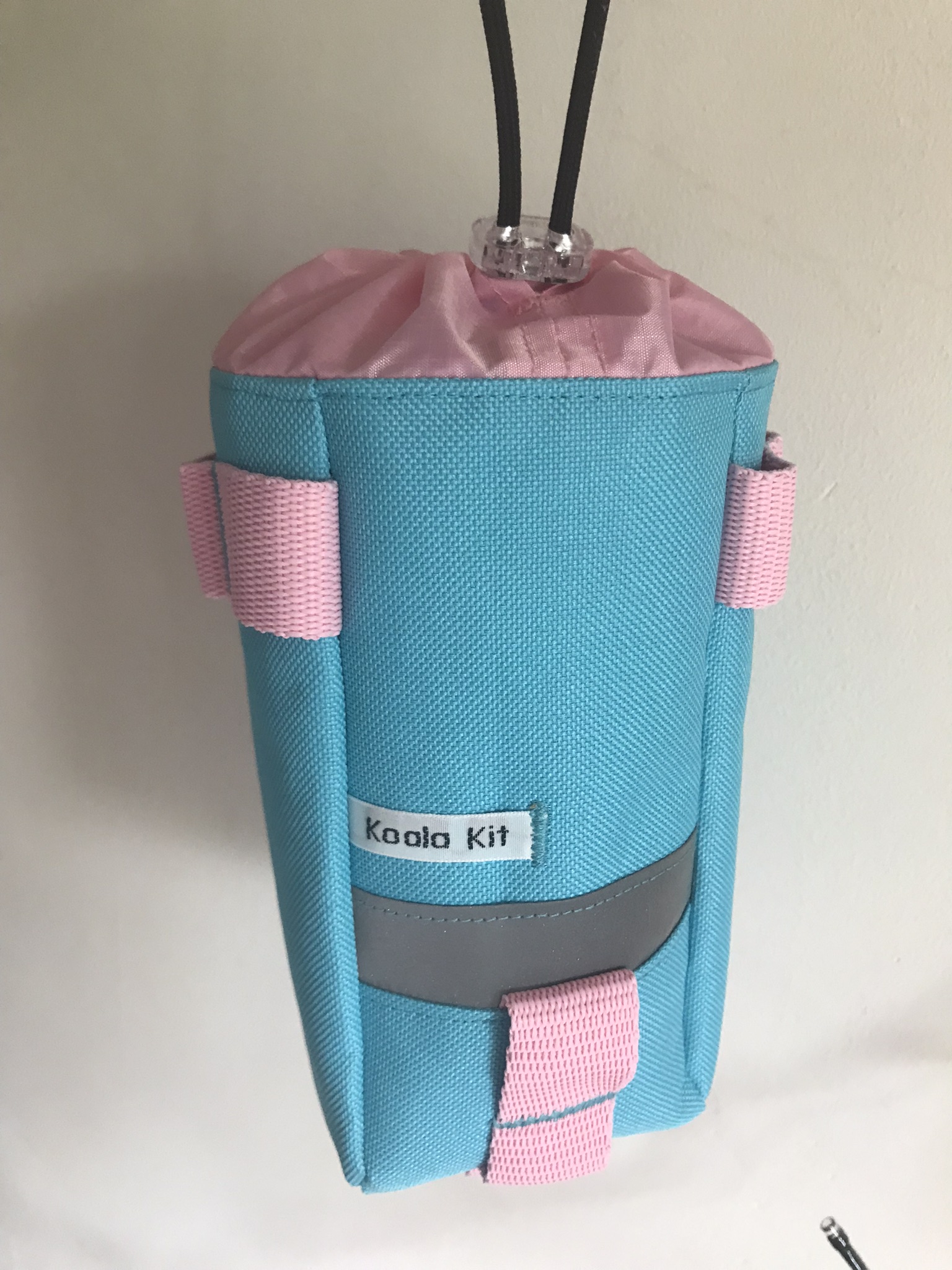 1x Koala Kit stem bag in Light Turquoise, with Light Pink webbing. The main body of the bag is Cordura with a ripstop nylon closure and lining. There are two reflective trims and a transparent cord stopper. Light Turquoise with Light Pink webbing.