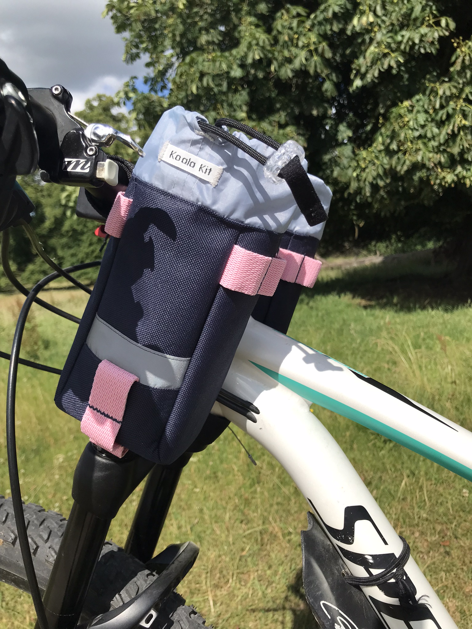 1 x Koala Kit stem bag in Navy, with Pale Pink webbing. The main body of the bag is Cordura with a ripstop nylon closure and lining. There are two reflective trims and a transparent cord stopper. Navy Pale Pink Webbing