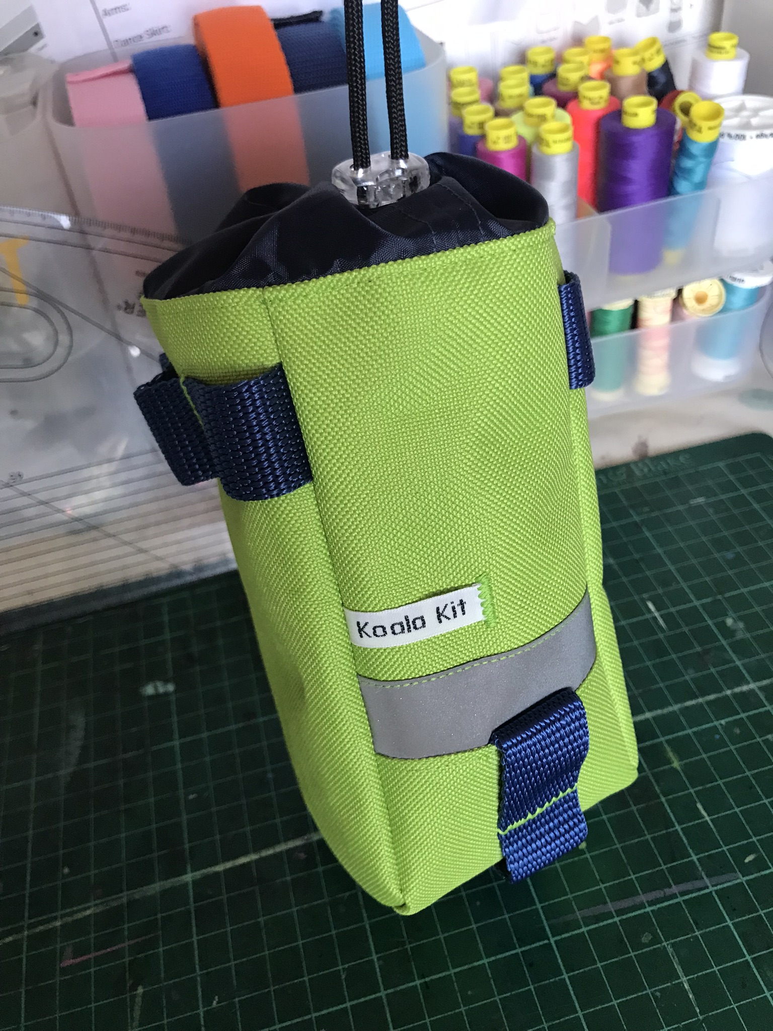 1x Koala Kit stem bag in Lime Green with Navy webbing. The main body of the bag is Cordura with a ripstop nylon closure and lining. There are two reflective trims and a transparent cord stopper. Lime Green, with Navy webbing.