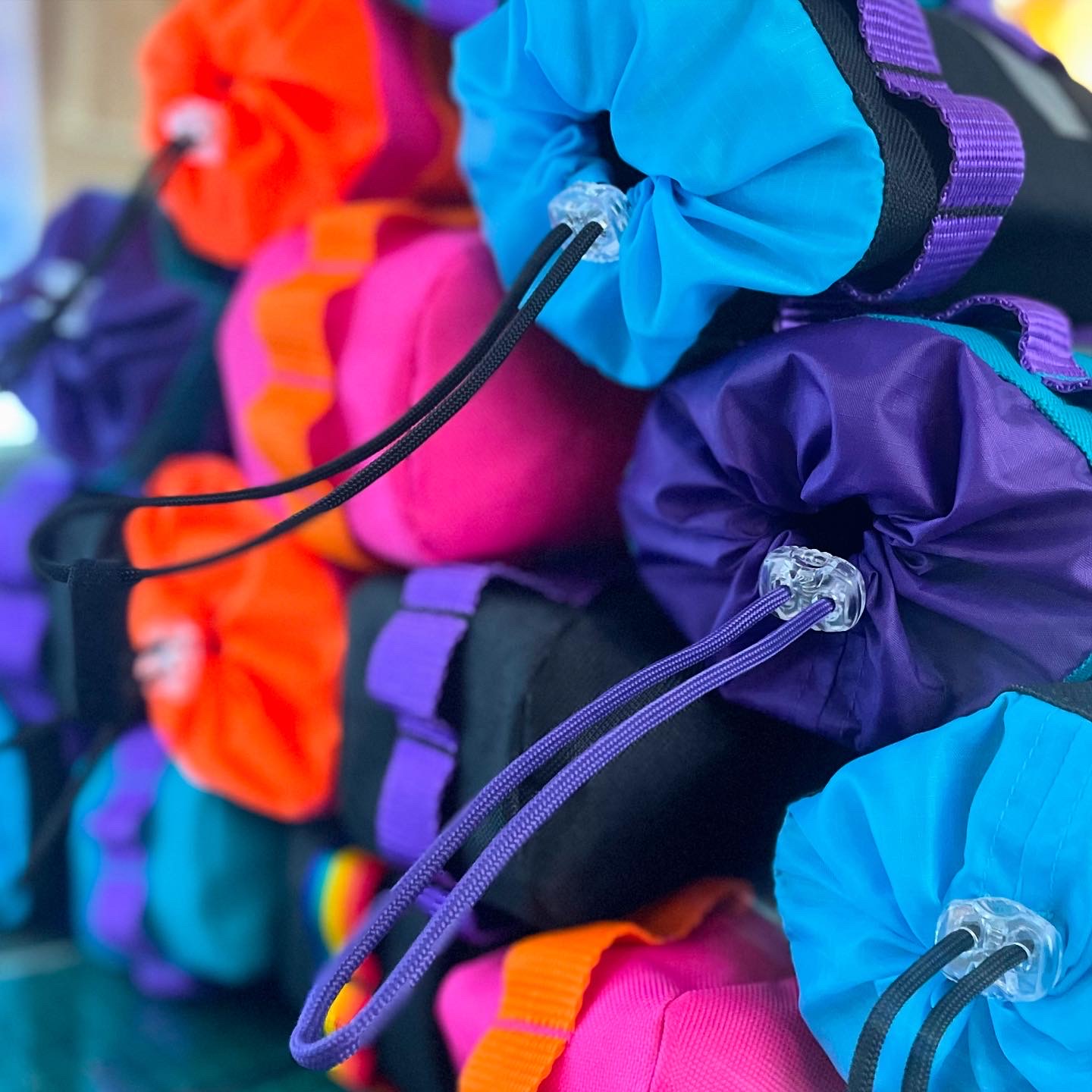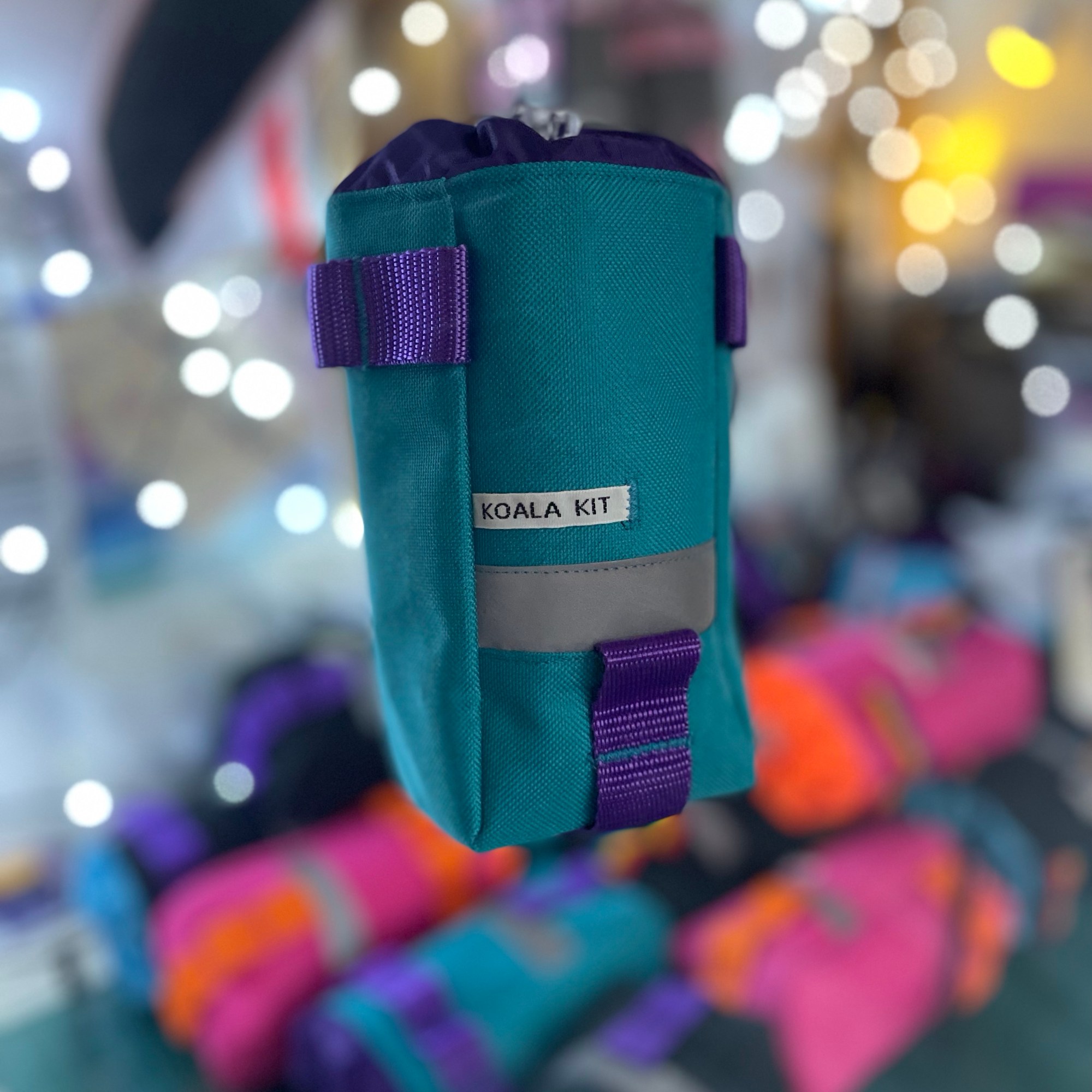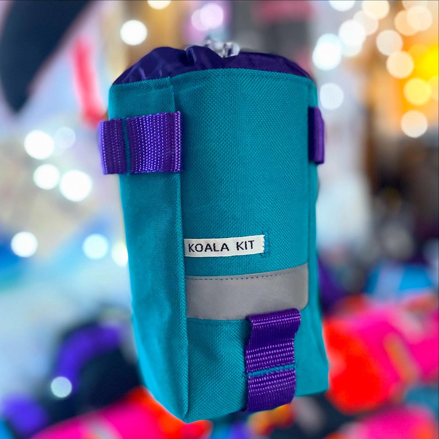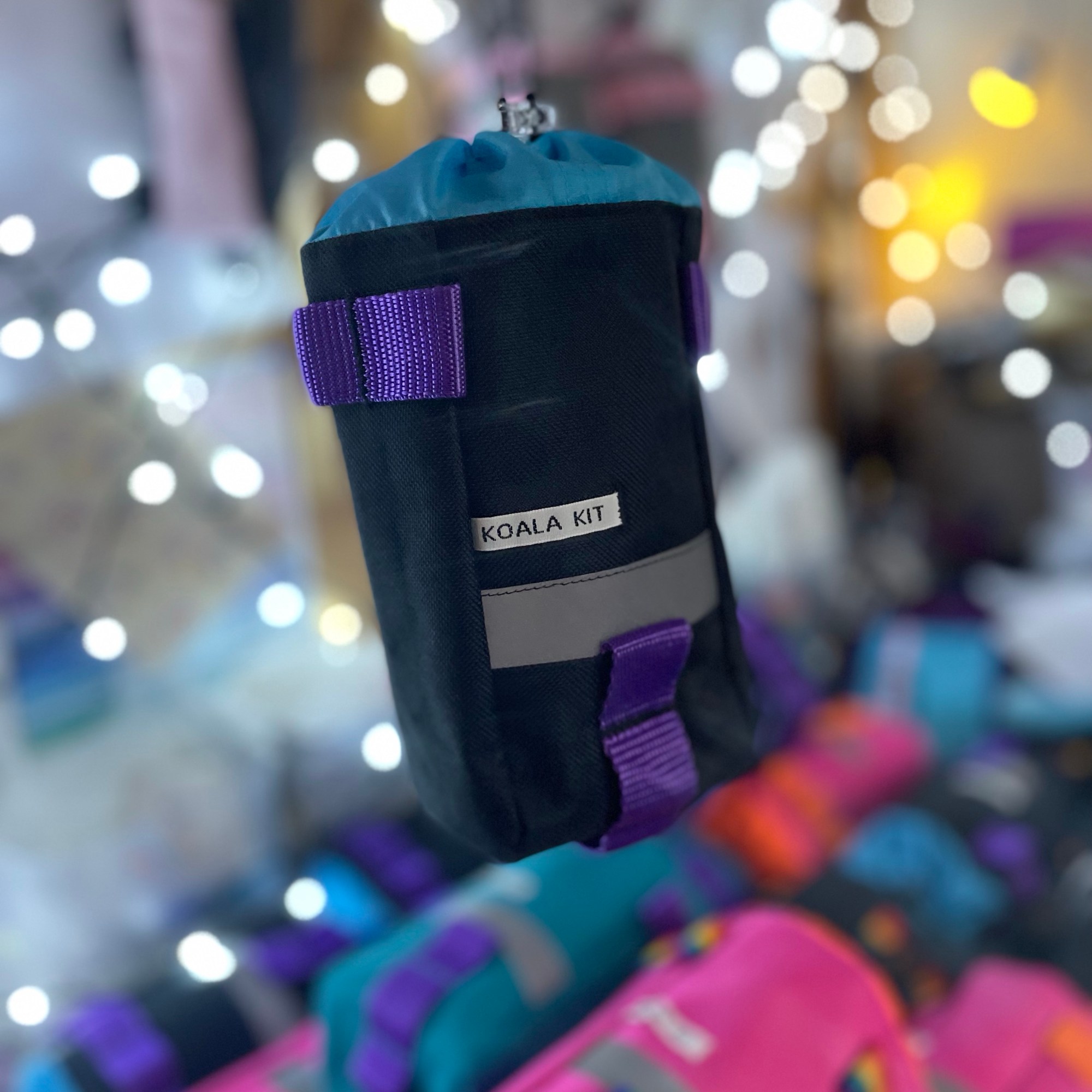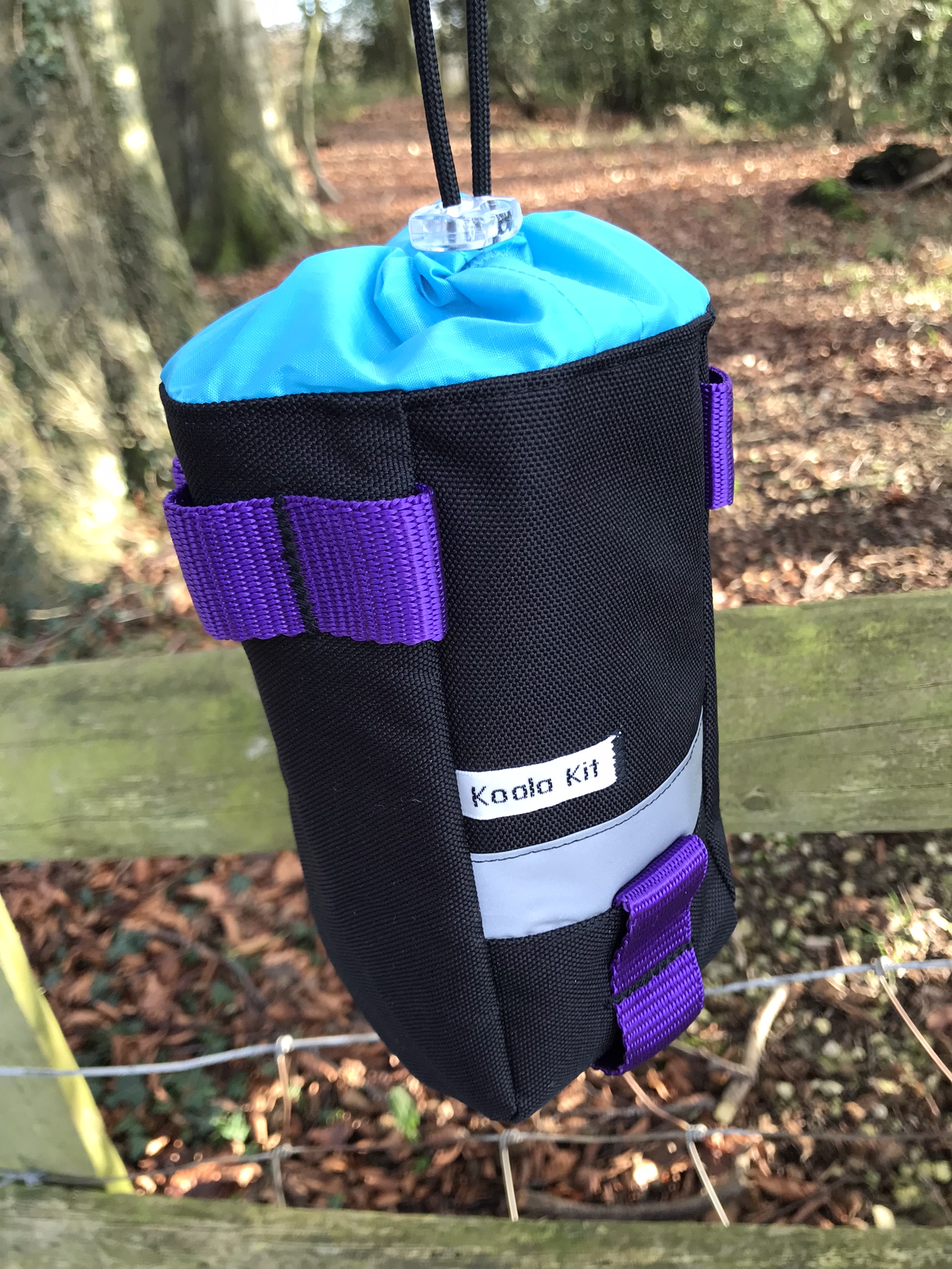 1x Koala Kit Stem Bag in Black with Purple Webbing and Turquoise Ripstop Closure. The main body of the bag is Cordura with a ripstop nylon closure and lining. There are two reflective trims and a transparent cord stopper. Black with Purple Webbing and Turquoise Closure.