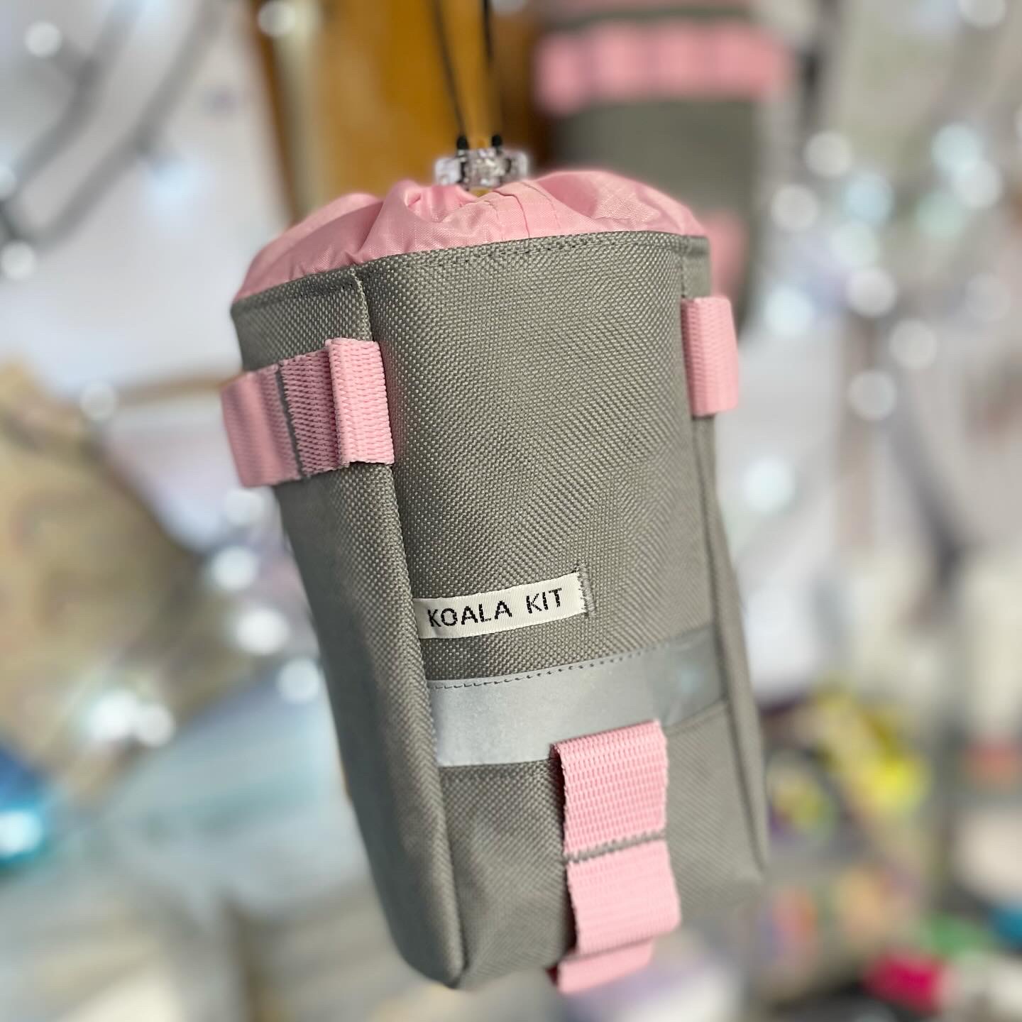 1x Koala Kit Stem Bag in Grey with Pale Pink Webbing and Pale Pink Ripstop Closure. The main body of the bag is Cordura with a ripstop nylon closure and lining. There are two reflective trims and a transparent cord stopper. Grey with Pale Pink Webbing and Pale Pink Closure.