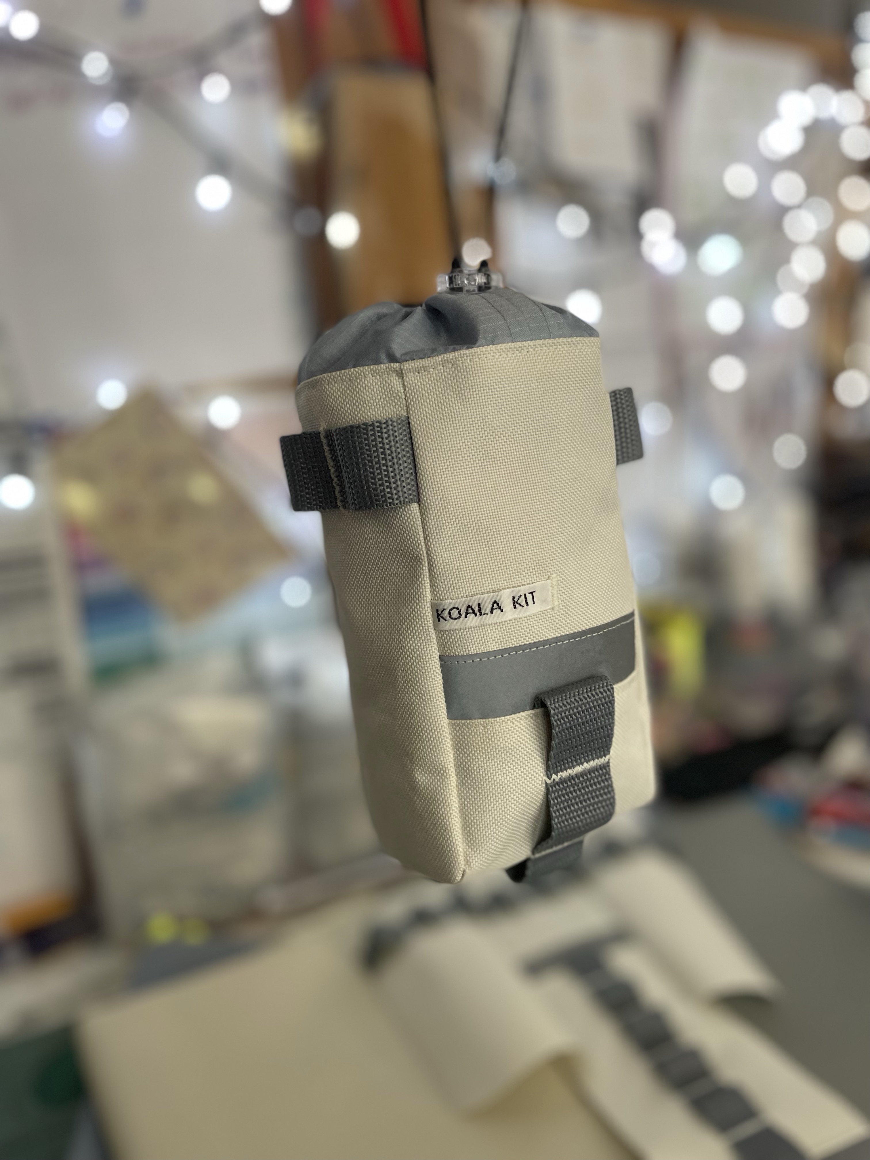 1x Koala Kit Stem Bag in Cream with Grey Webbing and Grey Ripstop Closure. The main body of the bag is Cordura with a ripstop nylon closure and lining. There are two reflective trims and a transparent cord stopper. J Cream with Grey Webbing and Grey Closure.