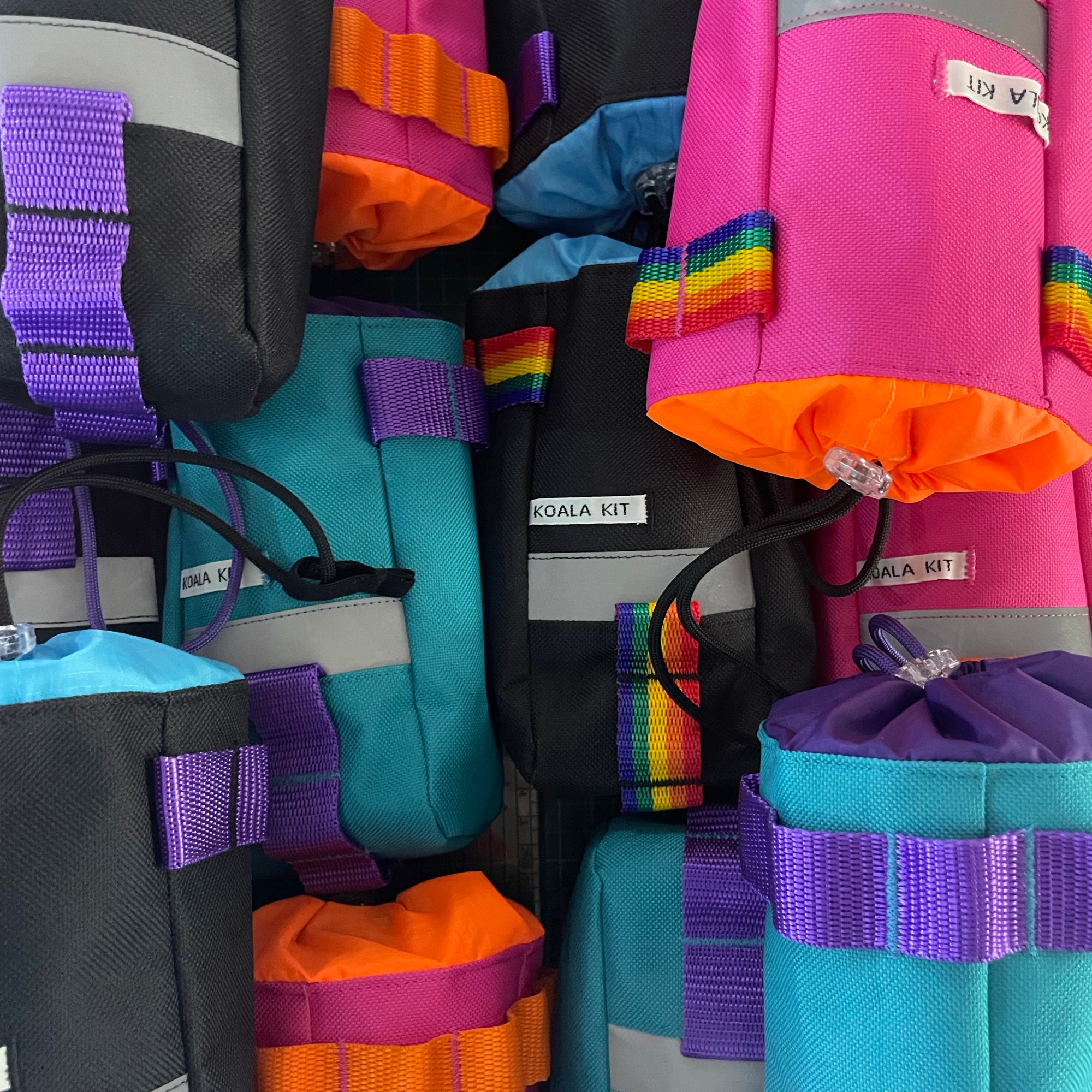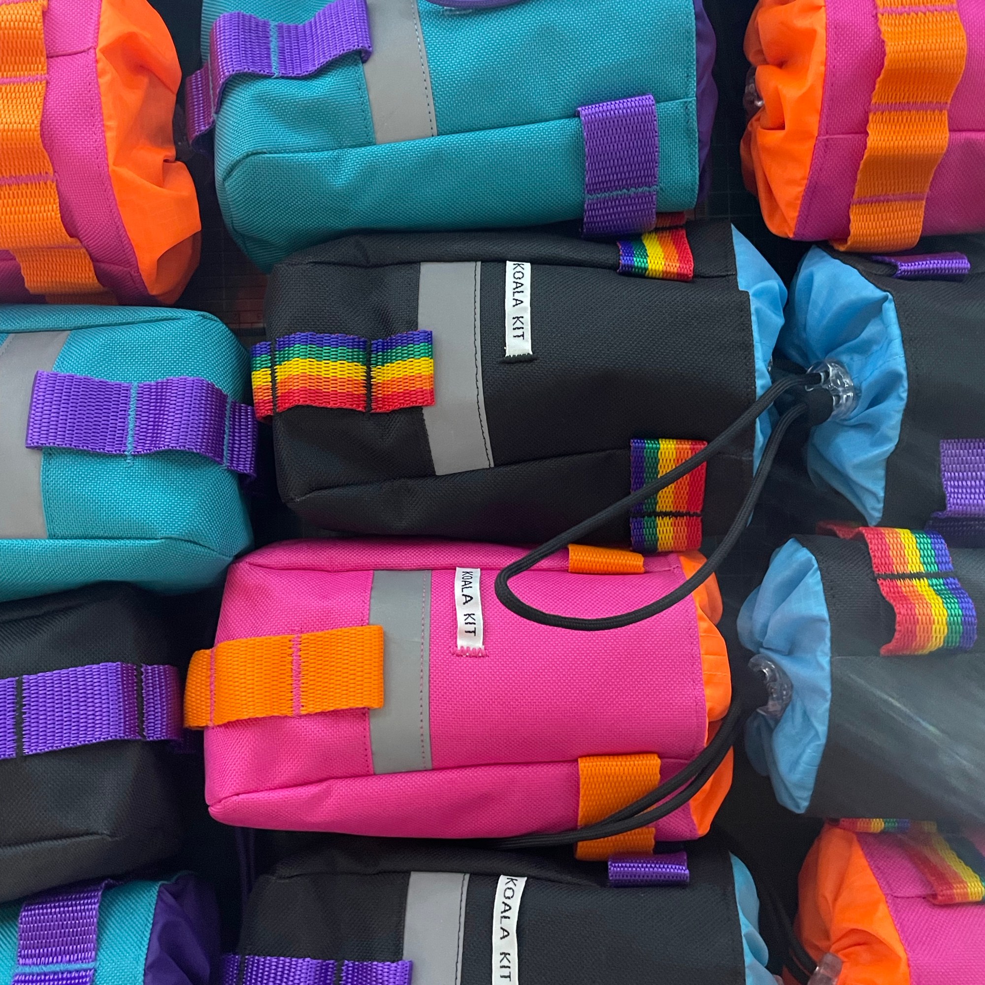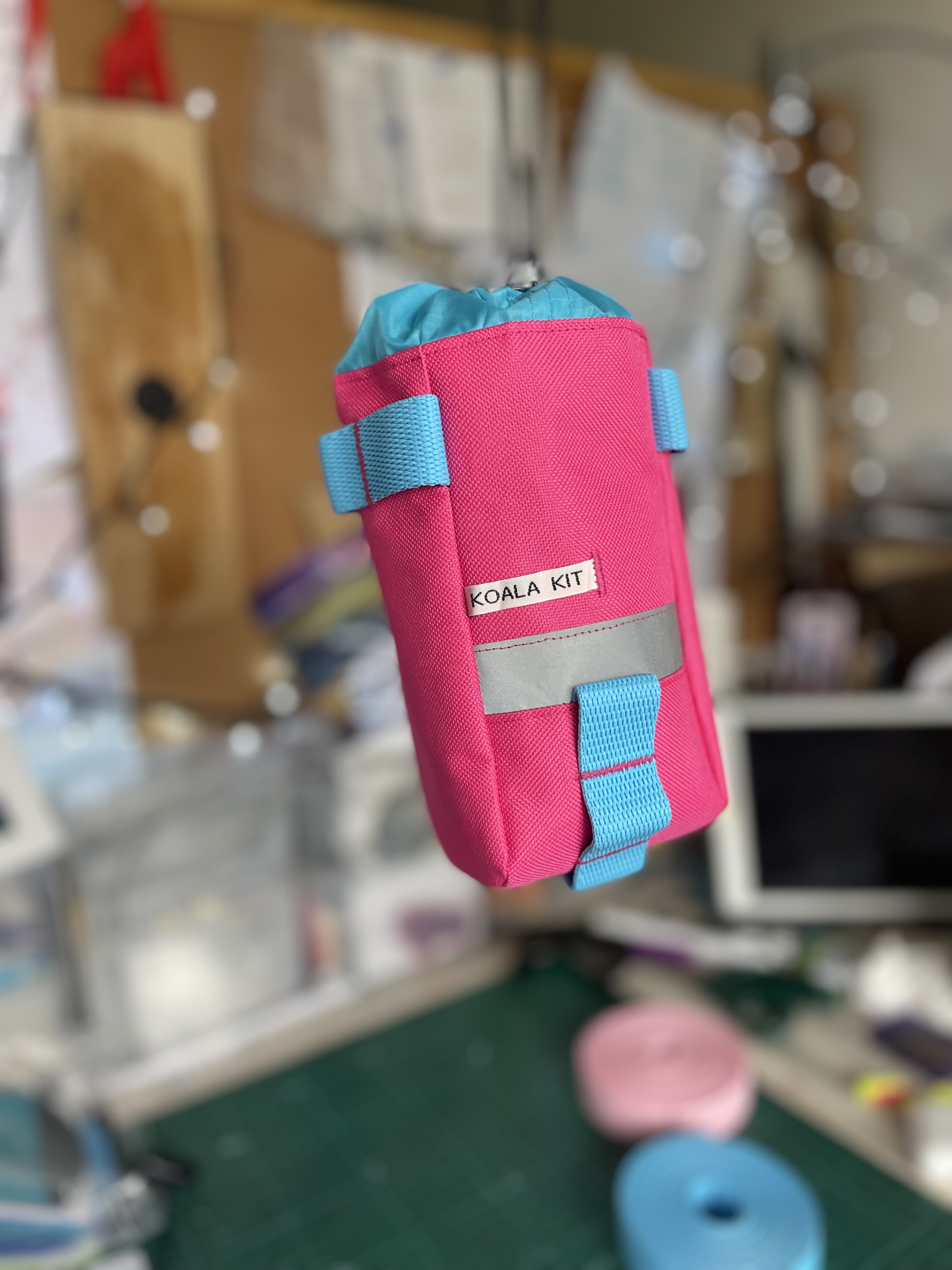 1x Koala Kit Stem Bag in Pink with Turquoise Webbing and Turquoise Ripstop Closure. The main body of the bag is Cordura with a ripstop nylon closure and lining. There are two reflective trims and a transparent cord stopper. Pink with Turquoise Webbing and Turquoise Closure.