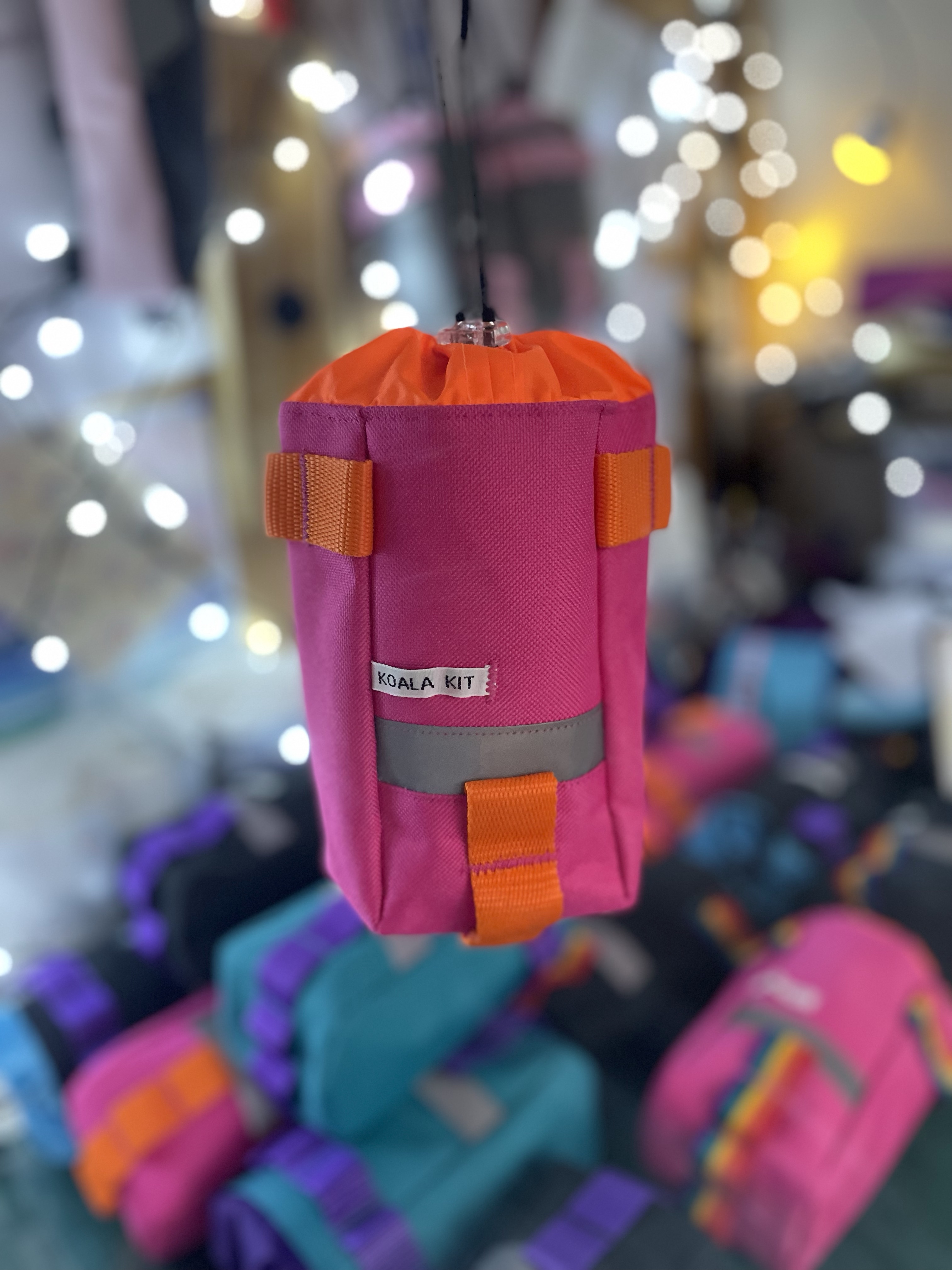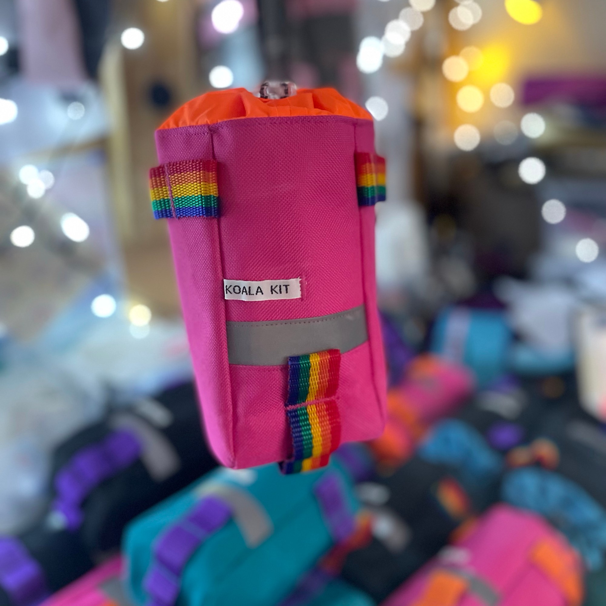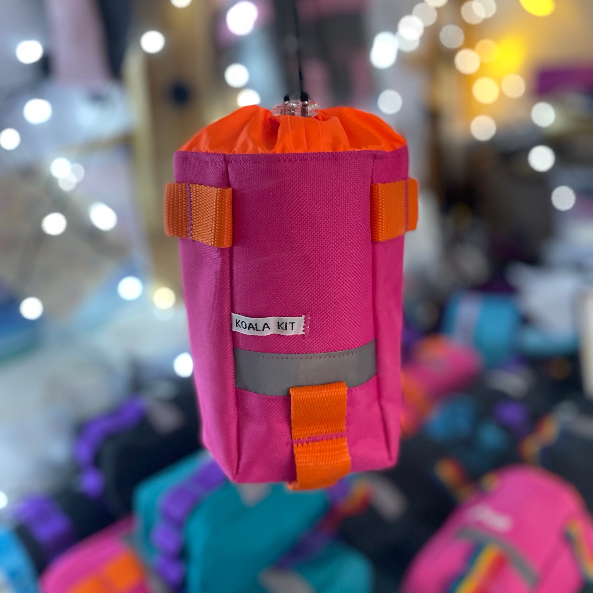 1 x Koala Kit stem bag in Pink with Orange webbing. The main body of the bag is cordura with a ripstop nylon closure and lining. There are two reflective trims, and a transparent cord stopper. Pink Orange webbing